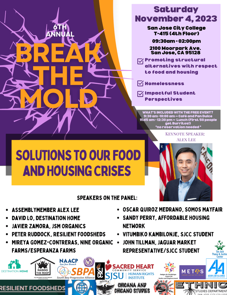 On Saturday, November 4, 2023 the 6th Annual Break the Mold Conference will be held at San Jose City College for the 2nd year. This year the focus of the half-day gathering will be on how to promote structural alternatives with respect to food and housing. The event will be led by students, faculty and partner organizations from around the South Bay, including SJCC MEChA, ALMASS, Ethnic Studies Department and Chicana and Chicano Studies, Associated Student Government (ASG), Human Agenda and Resilient Foodsheds. Featured speakers include elected officials, non-profit leaders, community advocates, and specialists in these areas. The student perspective will be represented on both panels. Ample time will be available for networking and creating new alliances.